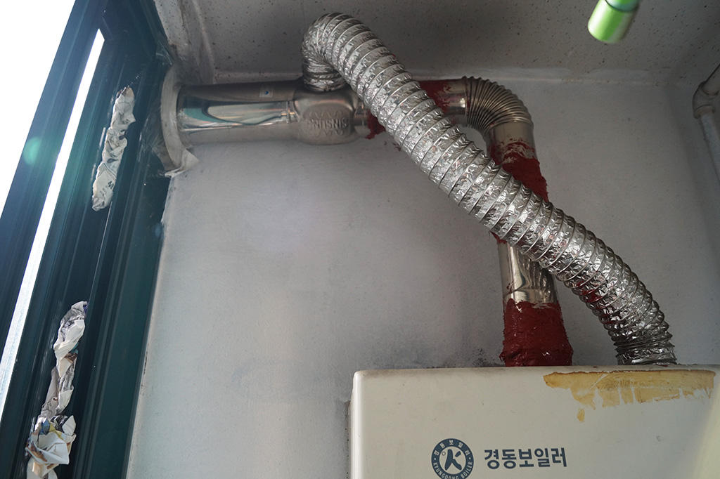 보일러 설치연도를 보니 2001년 10월이었습니다. 창문틈에는 태풍이 몰려왔을때 끼워둔 종이들이 아직도 있었습니다. 기상청 예보에 낚인듯 싶었지만 그래도 혹시나 해서... 정체불명의 빨간색은 접합부위에있던 석고들이 너덜너덜해 금속재로된 테이프로 감아두었었는데 가스 점검 나오신 분이 내열 실리콘을 칠하라해서 안전생각해 덕지덕지 발랐었습니다.