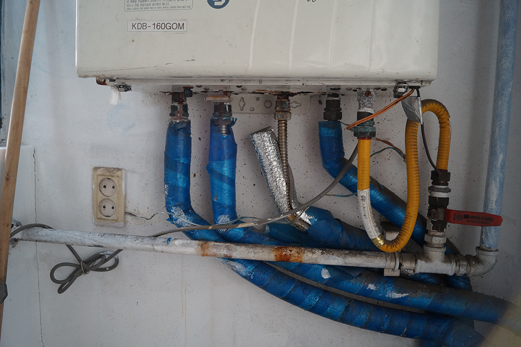 설치되어있던 경동 보일러는 내부에서 관이 터지면서 물이 밑으로 줄줄 새기 시작했습니다. 연결된 수도관을 중간에 잠그는 밸브가 없어 결국 이틀정도 수도를 잠궜다 틀어났다 하면서 지내기도... 보일러 교체시 배관 교체를 하게되면 물이 들어오는 관은 잠금장치를 해달라고 하세요.